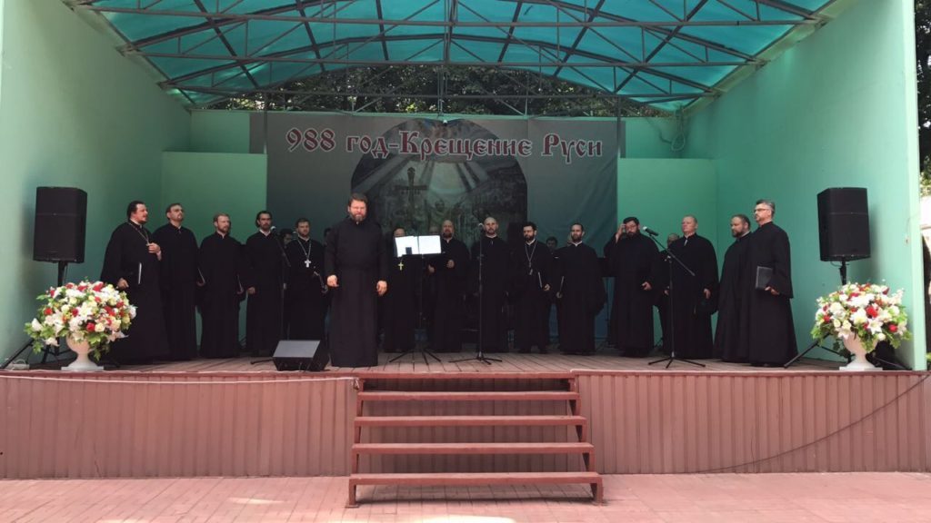 28 июля по благословению митрополита Санкт-Петербургского и Ладожского Варсонофия в Красном селе совместно с администрацией Красносельского района состоялось празднование 1030-летия крещения Руси. После Божественной литургии, которую возглавил благочинный Красносельского округа протоиерей Михаил Подолей, состоялся Праздничный концерт в Верхнем парке с участием Хора духовенства Санкт-Петербургской Митрополии под управлением Юрия Герасимова в сопровождении ансамбля духовых инструментов «Кронверк-брасс» под управлением Ильи Кузнецова. С летней эстрады звучали молитвы Богородице, величание князю Владимиру, Стихиры русским святым. Колоколам на звоннице вторил «Колокольный звон» из оперы «Борис Годунов» Мусоргского в исполнении музыкантов «Кронверк-брасса». Солист и ведущий концерта диакон Антоний Малаховский вдохновенно исполнил шедевр Свиридова на стихи Есенина «О Родина!». Мужественно и сурово — так можно описать характер и звучание нового номера программы хора и оркестра. «Вера вечна» — гимн Православия, написанный свт. Николаем Сербским, теперь есть и в репертуаре Духовенства. Как всегда, оригинальные аранжировки руководителя оркестра Ильи Кузнецова придали даже хорошо известным песням, новое свежее звучание. «Выйду ночью в поле с конем» спели неожиданно для слушателей сами оркестранты, продемонстрировав великолепные вокальные способности. Этот концерт мог бы продолжаться и до самого вечера, но участники и Хора духовенства, и Кронверк-брасса поспешили на всенощное бдение каждый на свой приход нашего большого города. Чтобы еще раз поблагодарить Господа за то, что наша страна более тысячи лет назад благодаря святому князю Владимиру была крещена и просвещена нашей православной верой.