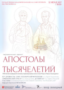 12 июля, в год 1950-летия праведной кончины первоверховных апостолов Петра и Павла, Совет по культуре Санкт-Петербургской епархии совместно с Комитетом по культуре Санкт-Петербурга и Государственной академической капеллой представляют музыкальный проект «Апостолы тысячелетий».