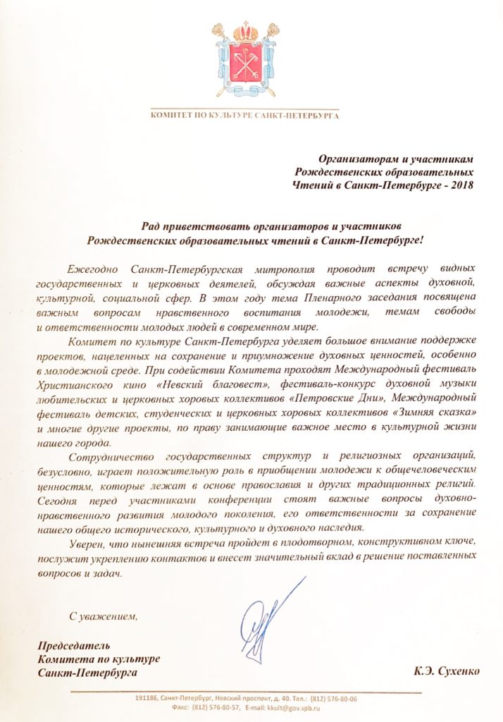 Приветствие председателя Комитета по культуре Санкт-Петербурга Константина Сухенко: