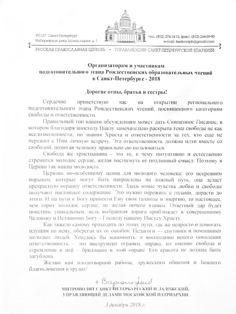 Приветствие митрополита Санкт-Петербургского и Ладожского Варсонофия гостям и организаторам Чтений: