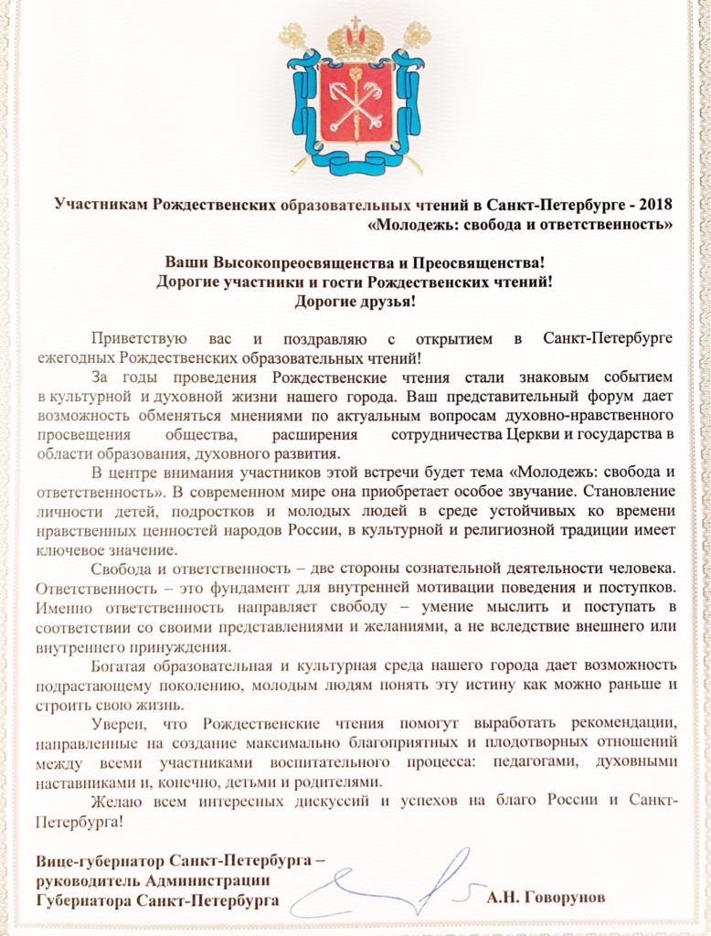 Приветственные слова в адрес организаторов и гостей направил митрополит Санкт-Петербургский и Ладожский Варсонофий, а также вице-губернатор Санкт-Петербурга, руководитель Администрации Губернатора Санкт-Петербурга Александр Говорунов.