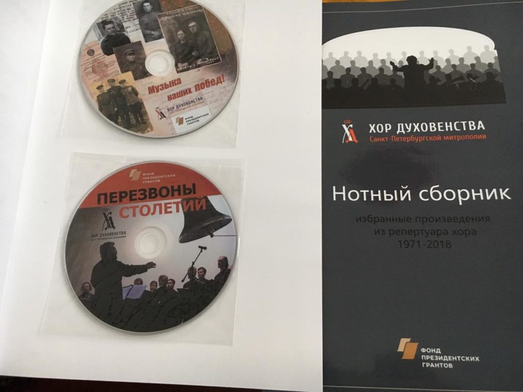 Священник представил гостям мероприятия видеозапись «Перезвоны столетий» и нотный сборник из репертуара Хора духовенства Санкт-Петербургской митрополии, которые были созданы в рамках завершенного гранта «Перезвоны столетий: духовная культура и современное образование — перспектива единства», который реализовался с использованием гранта Президента Российской Федерации на развитие гражданского общества, предоставленного Фондом президентских грантов.