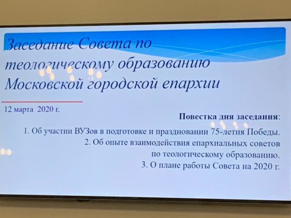 2 марта 2020 года члены Совета по теологическому образованию Санкт-Петербургской епархии приняли участие в заседании аналогичного совета Московской городской епархии в здании Общецерковной аспирантуры и докторантуры. От Петербургской стороны выступили председатель Отдела по религиозному образованию и катехизации, кандидат богословия иерей Илия Макаров и председатель Отдела по тюремному служению, доктор богословия протоиерей Олег Скоморох.