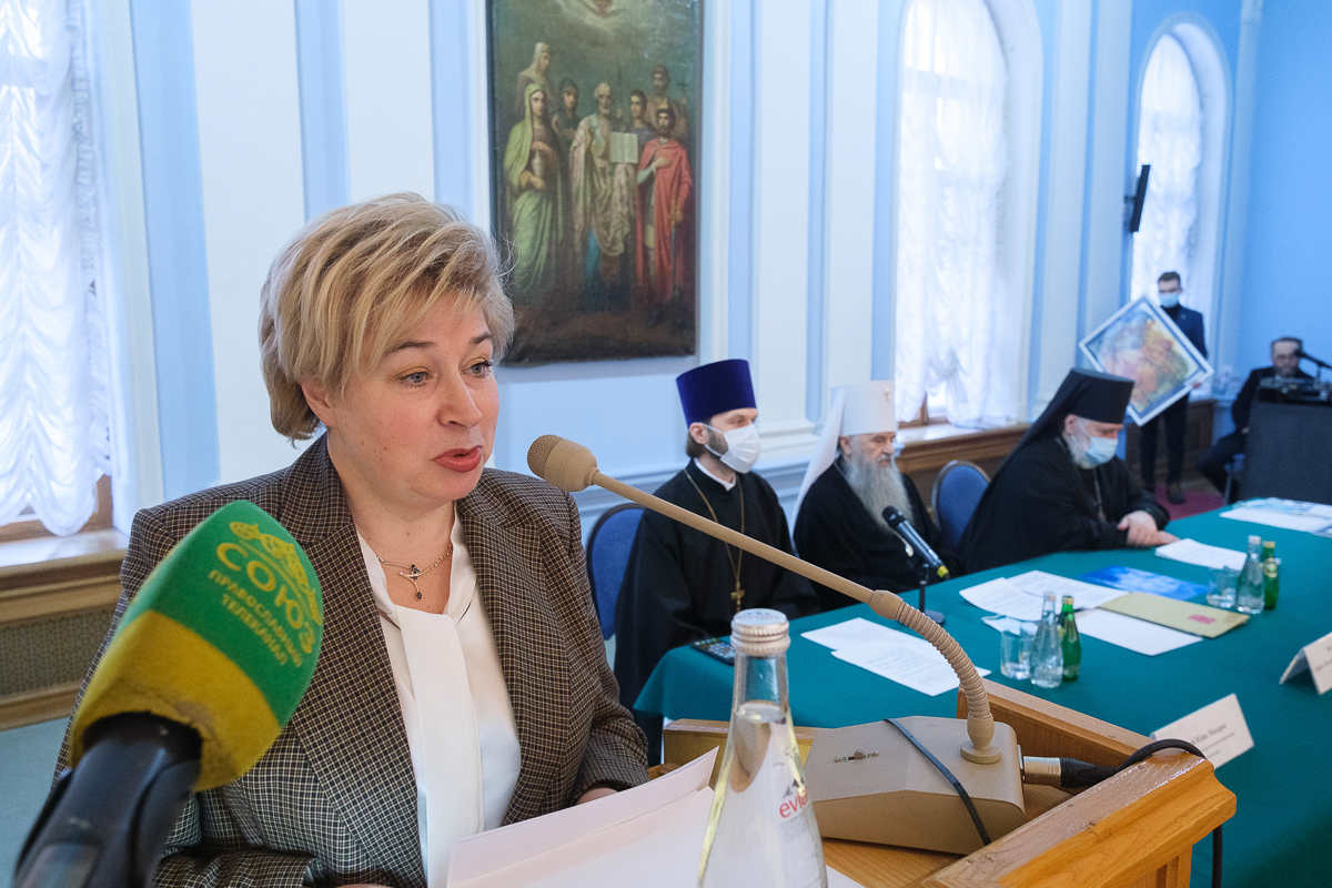 Председатель городского комитета по образованию Наталия Путиловская подчеркнула, что чтения способствуют укреплению сотрудничества между государством и Церковью. Церковь напоминает, что материальное — не главное, важнее духовная составляющая образования и воспитания, поэтому так важно сотрудничество с епархией. Проводится множество совместных мероприятий, например, конкурс «За нравственный подвиг учителя». Коснувшись темы преподавания ОРКСЭ, она отметила, что все больше родителей выбирают для своих детей модули «Основы православной культуры» или «Основы мировых религиозных культур» — в этом курсе большая часть посвящена православной культуре. Таким образом, примерно 70 процентов четвероклассников в нашем городе знакомятся с основами православной культуры. Наталия Путиловская передала в дар епархии работу воспитанницы художественной студии Дворца творчества юных — акварель, изображающую Свято-Троицкий собор Александро-Невской лавры.