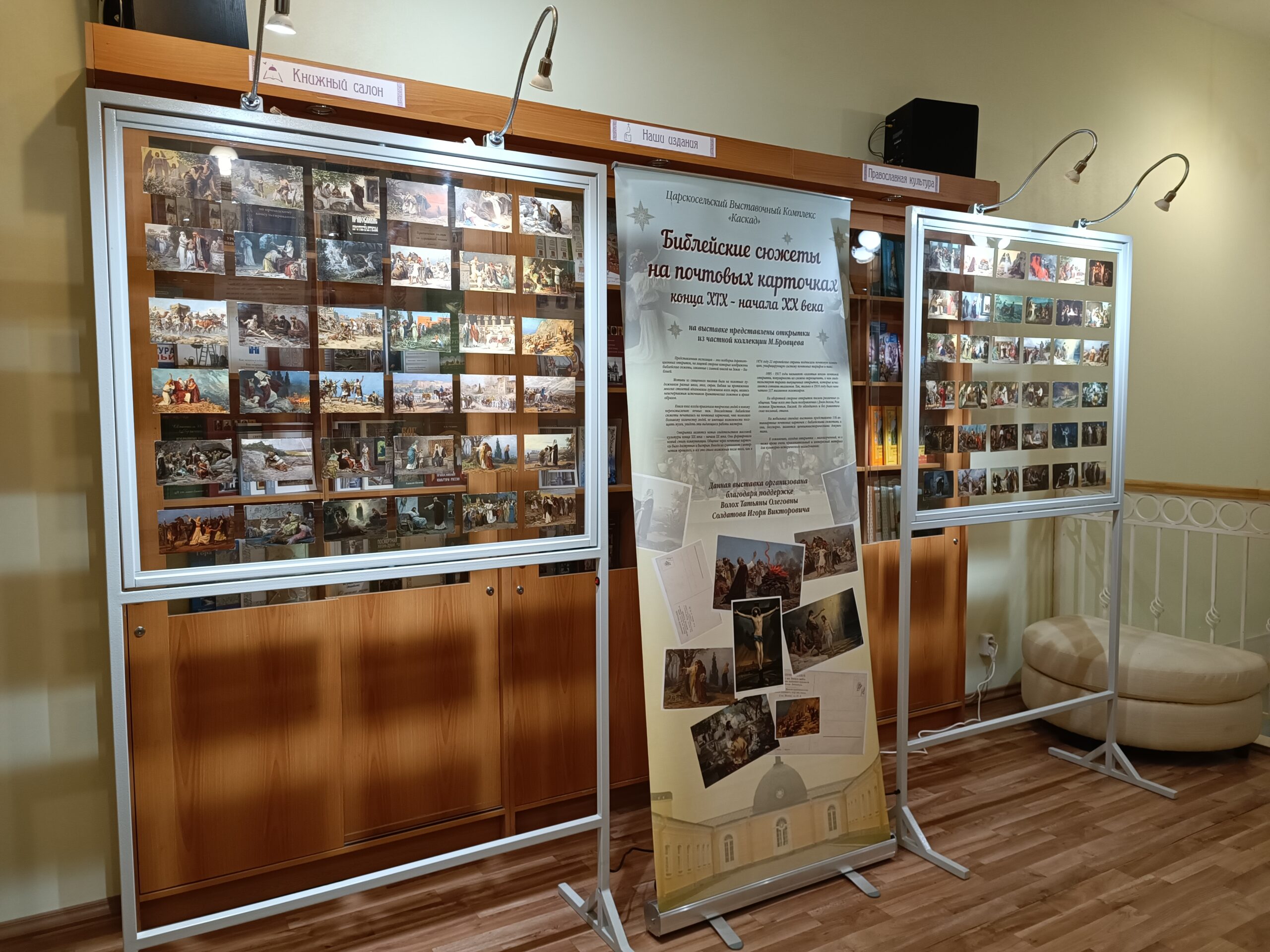 На двух стендах разместились семьдесят две дореволюционные, ставшие сегодня антикварными, карточки, изображающие сцены от изгнания Адама и Евы из рая до событий Воскресения Христова.