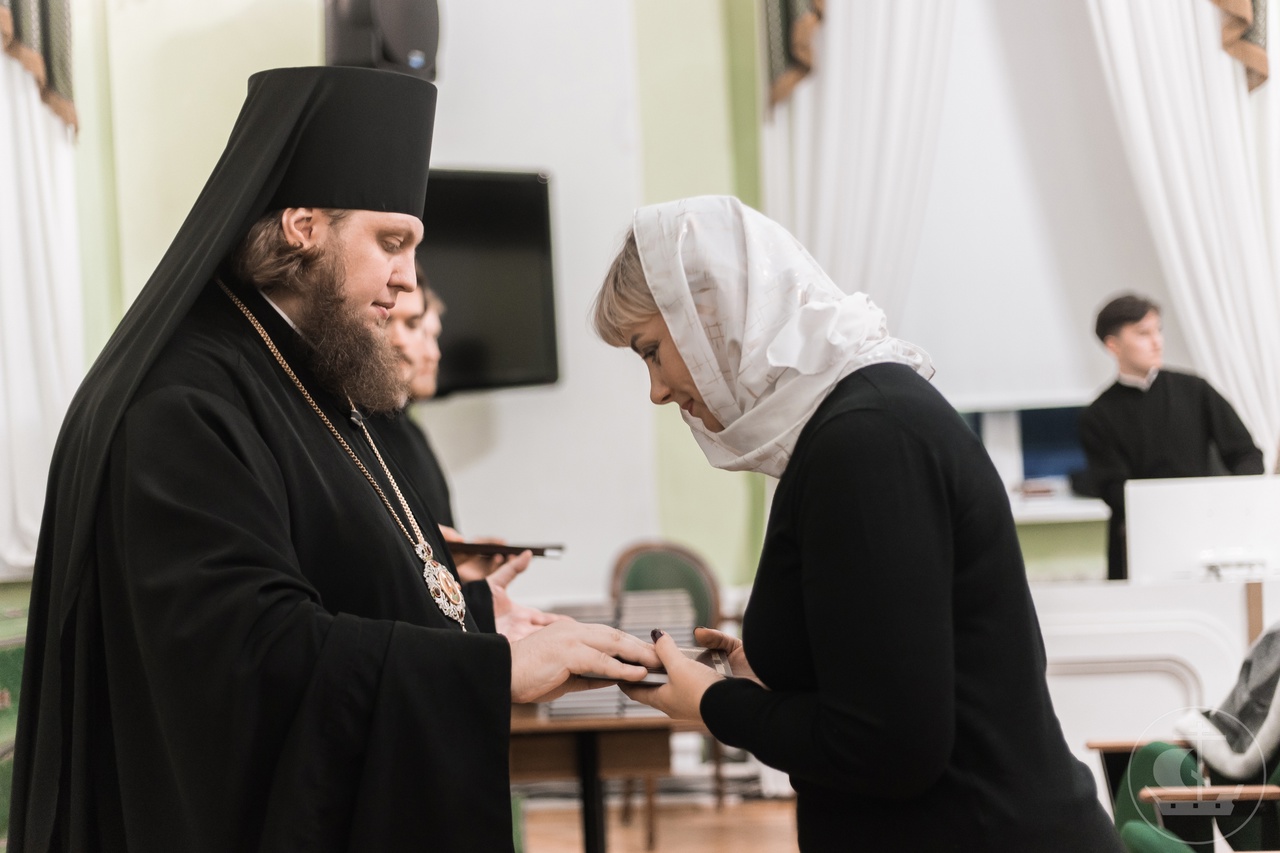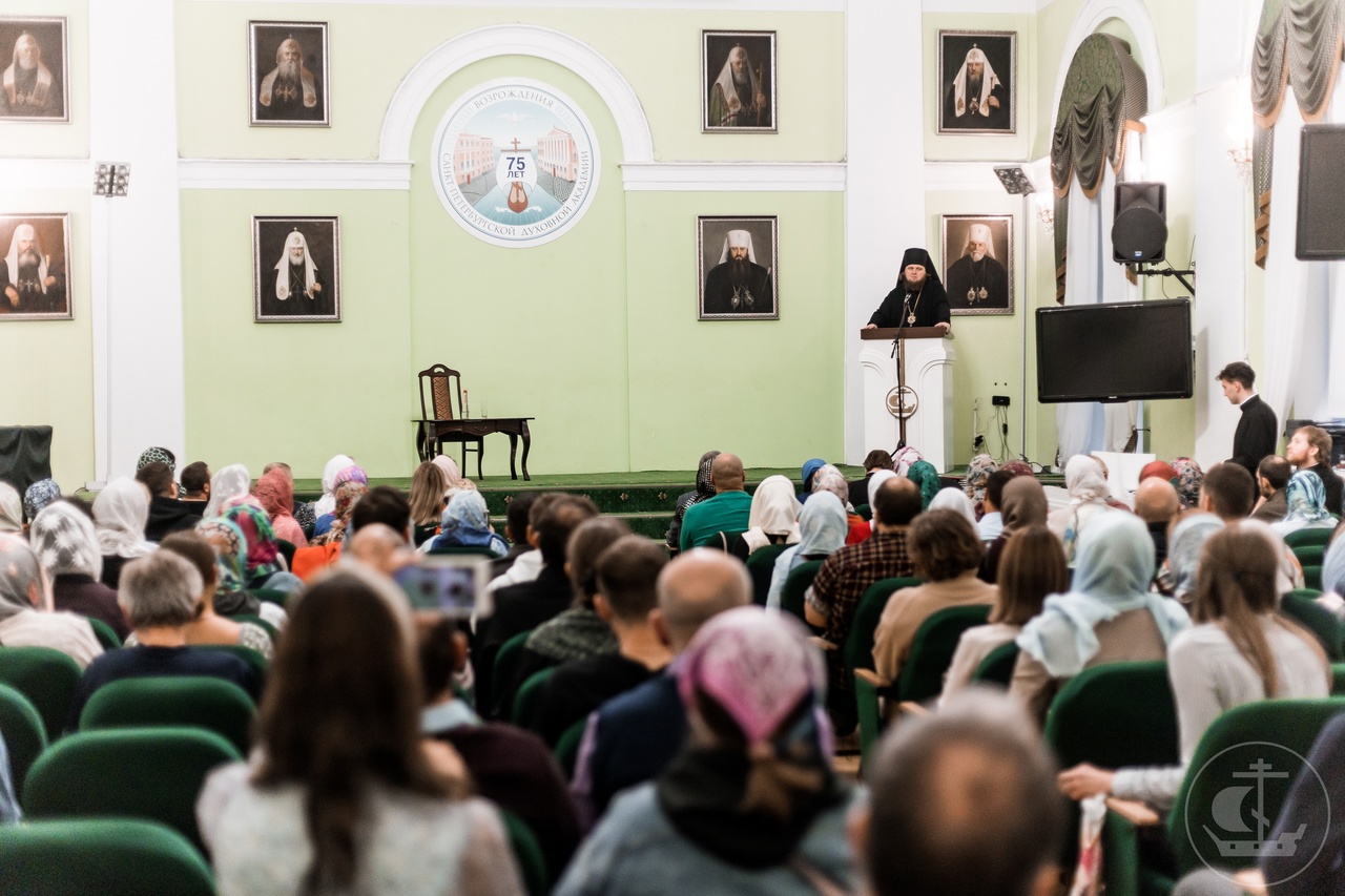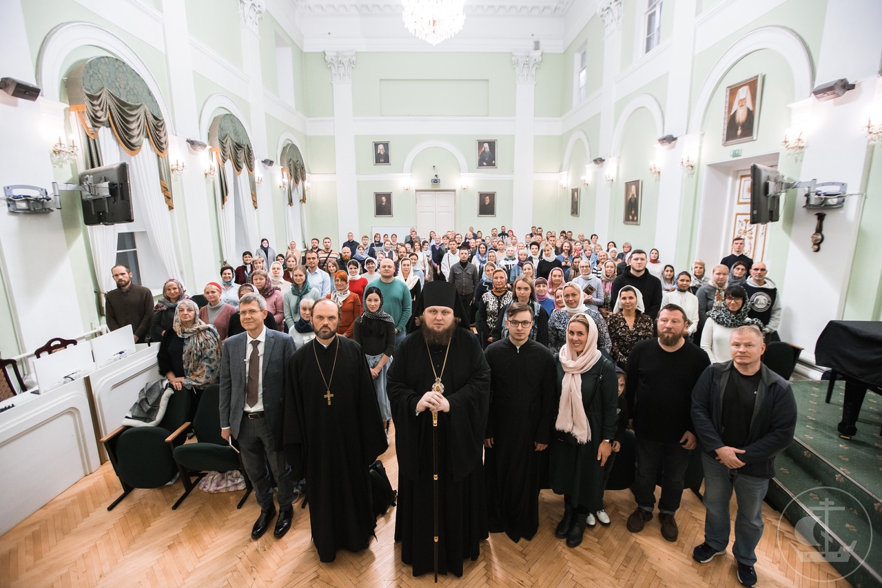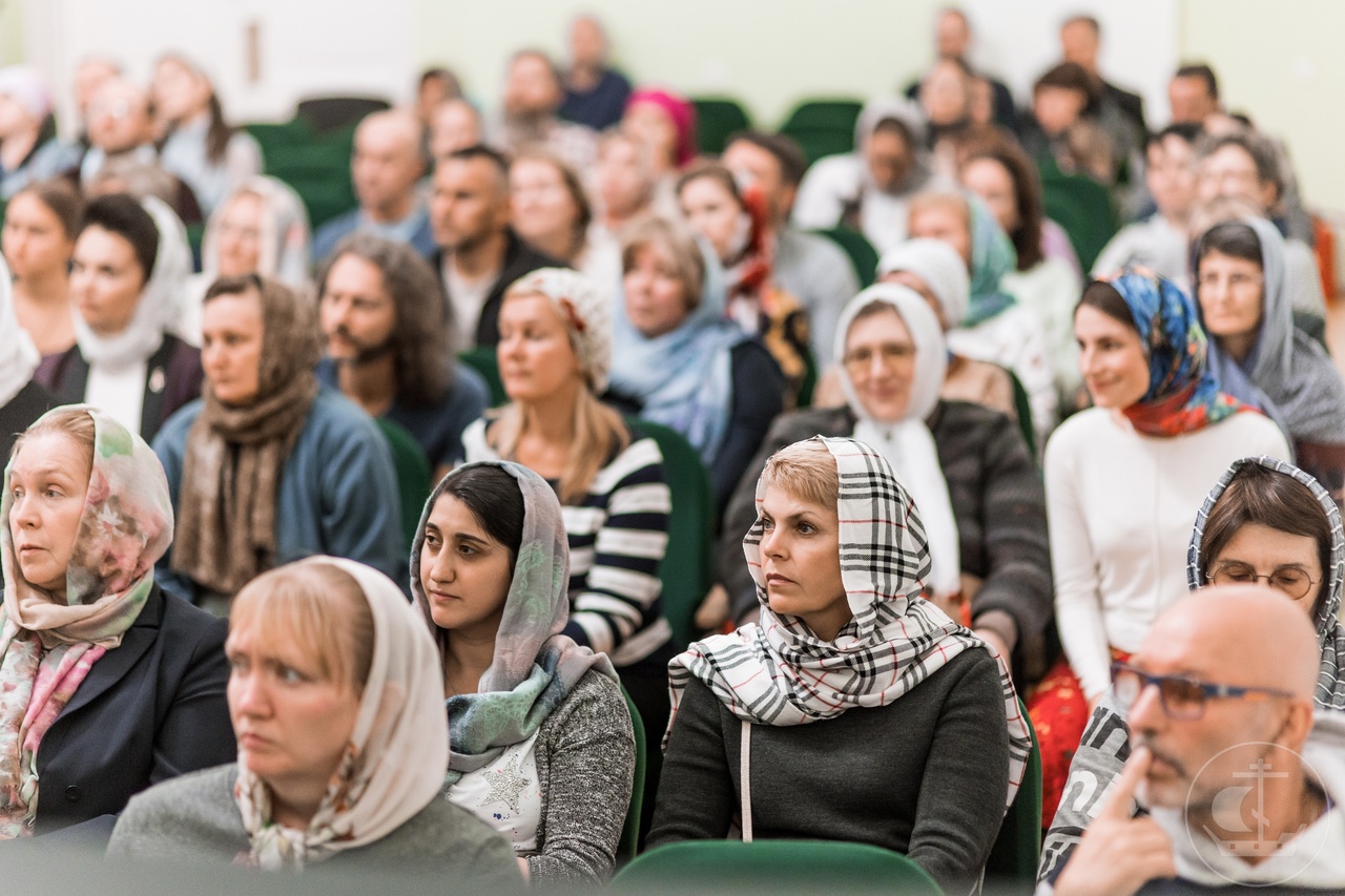 После небольшого концерта, во время которого Ансамбль студентов Санкт-Петербургской Духовной Академии под управлением Владлена Смирнова исполнил «Взбранной воеводе», «О, пресладкий и всещедный Иисусе», «Тебе необоримую стену», состоялась лекция председателя Отдела, иерея Илии Макарова.