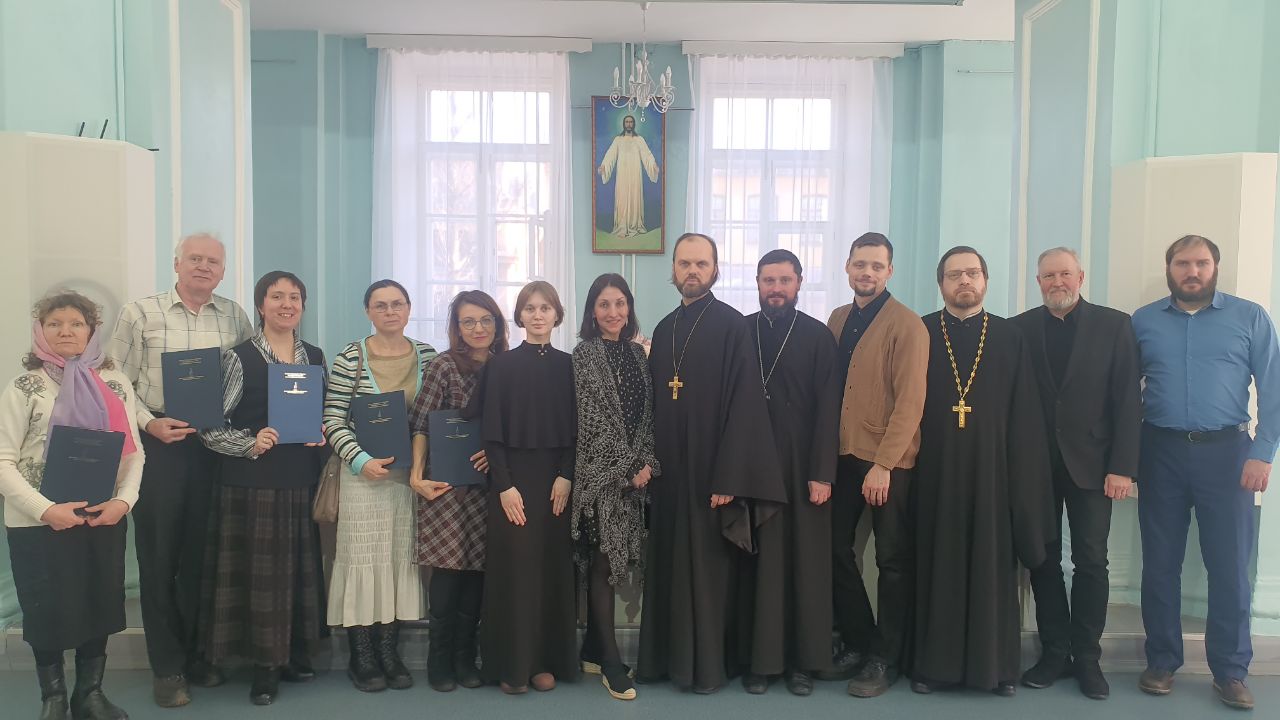 17 марта 2022 года в Бирюзовом зале Отдела религиозного образования и катехизации Санкт-Петербургской епархии состоялось торжественное вручение документов тьюторам, прошедшим обучение по программе дополнительного образования «Основы коммуникативной деятельности в сфере религиозного образования: взаимодействие с органами власти, образования и культуры, СМИ».