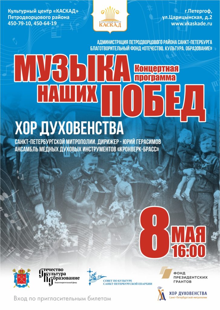 8 мая в рамках проекта «Перезвоны столетий: духовная культура и современное образование — перспектива единства», который реализуется с использованием гранта Президента Российской Федерации на развитие гражданского общества, предоставленного Фондом президентских грантов, в Петергофе состоится музыкальный концерт «Музыка наших побед «. В программе — выступления Хора духовенства Санкт-Петербургской митрополии под управлением Юрия Герасимова и ансамбля медных духовых инструментов «Кронверк Брасс».