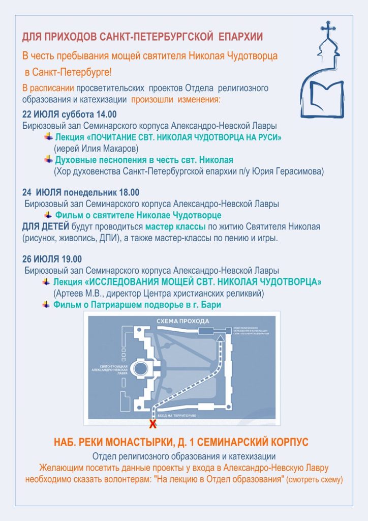 С 13 по 28 июля в Троицком соборе Александро-Невской лавры будет пребывать часть мощей святителя Николая Чудотворца. В 2017 года святые мощи впервые в истории были принесены из Бари в Россию, где с 21 мая находились в Храме Христа Спасителя в Москве.
